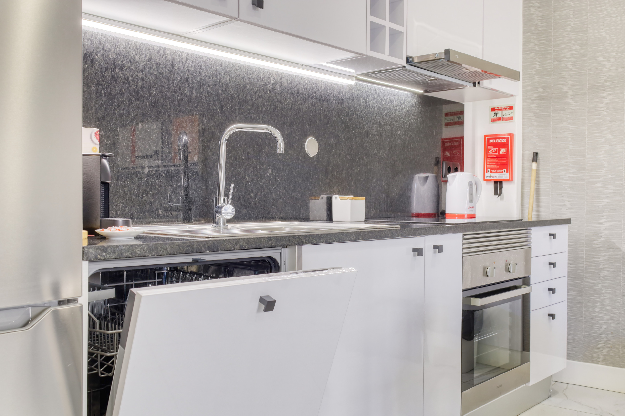 O apartamento está equipado com frigorífico e congelador, máquina de lavar louça, máquina de lavar roupa, placa vitrocerâmica, forno e demais utensílios, além de roupas de cama, toalhas, Wi-Fi, TV com canais internacionais, entre outras comodidades para proporcionar uma estadia agradável e descontraída.