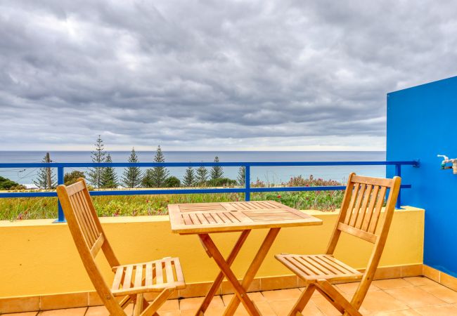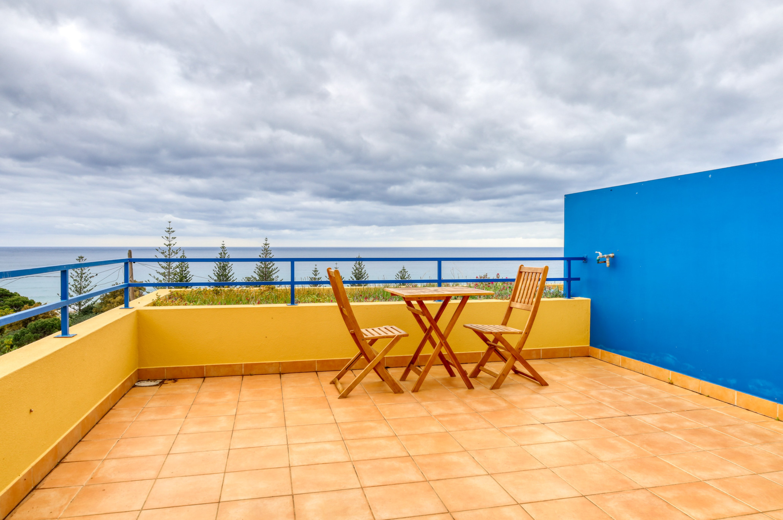 O alojamento tem um terraço espaçoso com vista para o mar e com uma mesa de refeições ao ar livre.