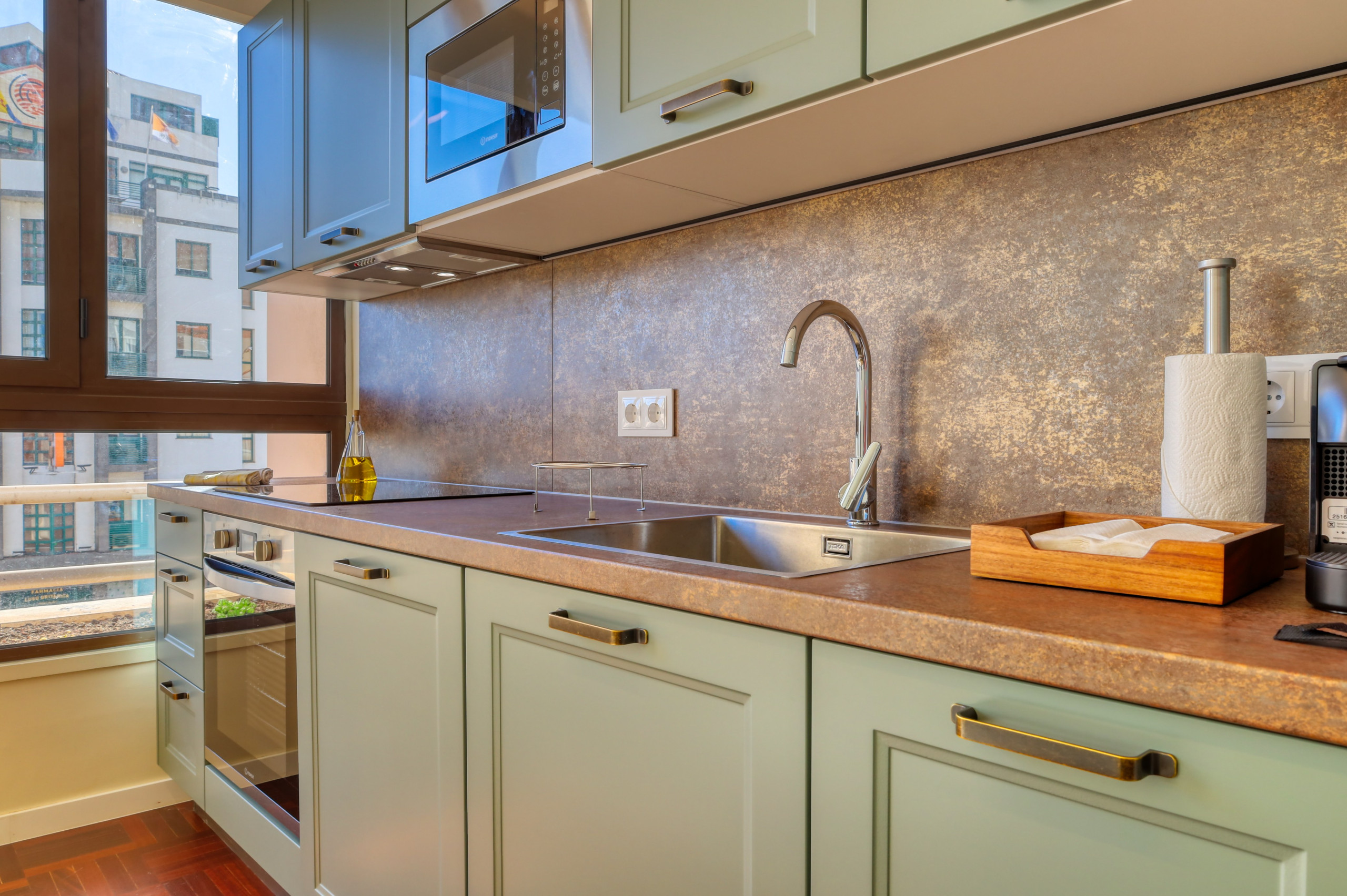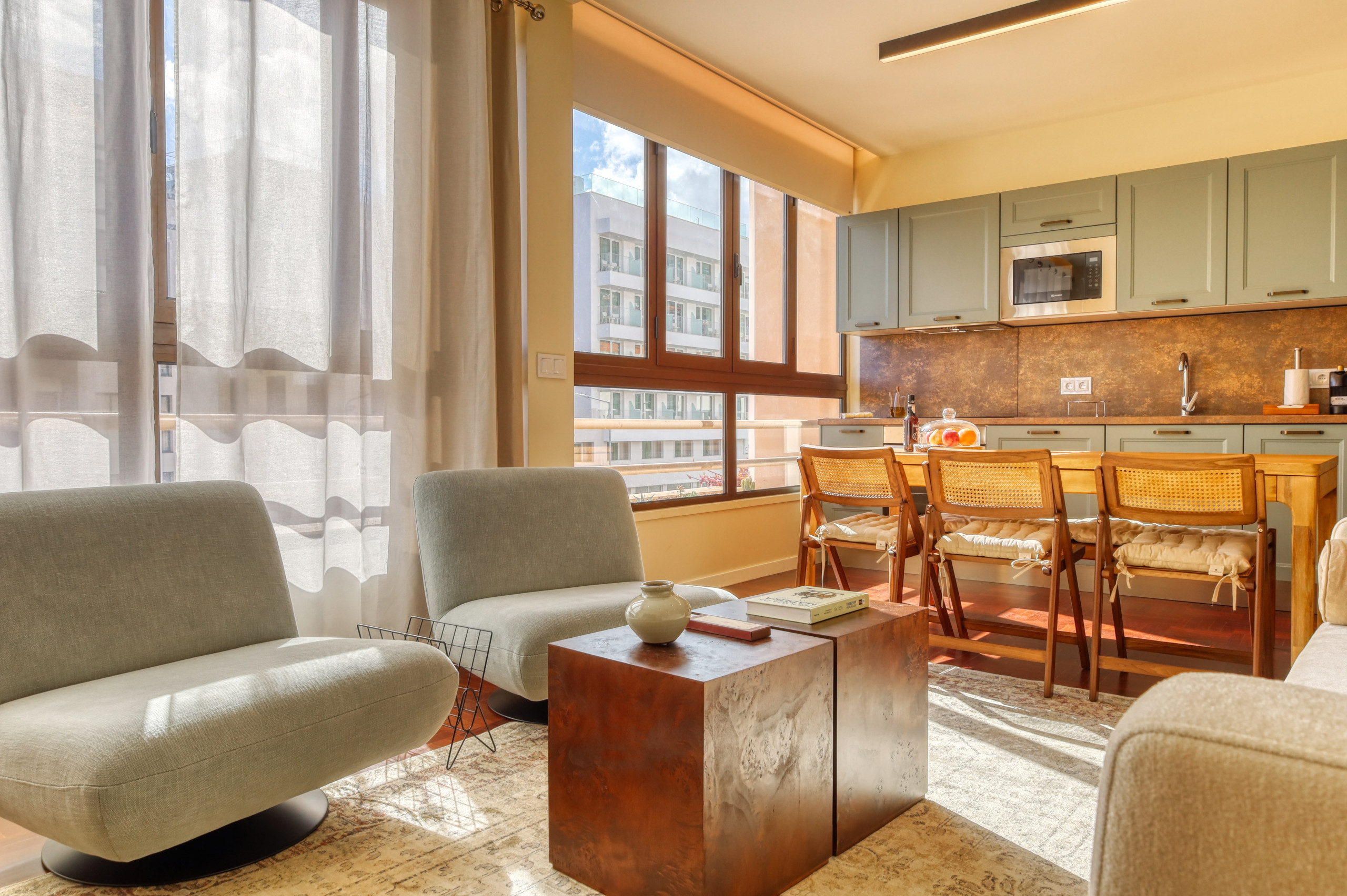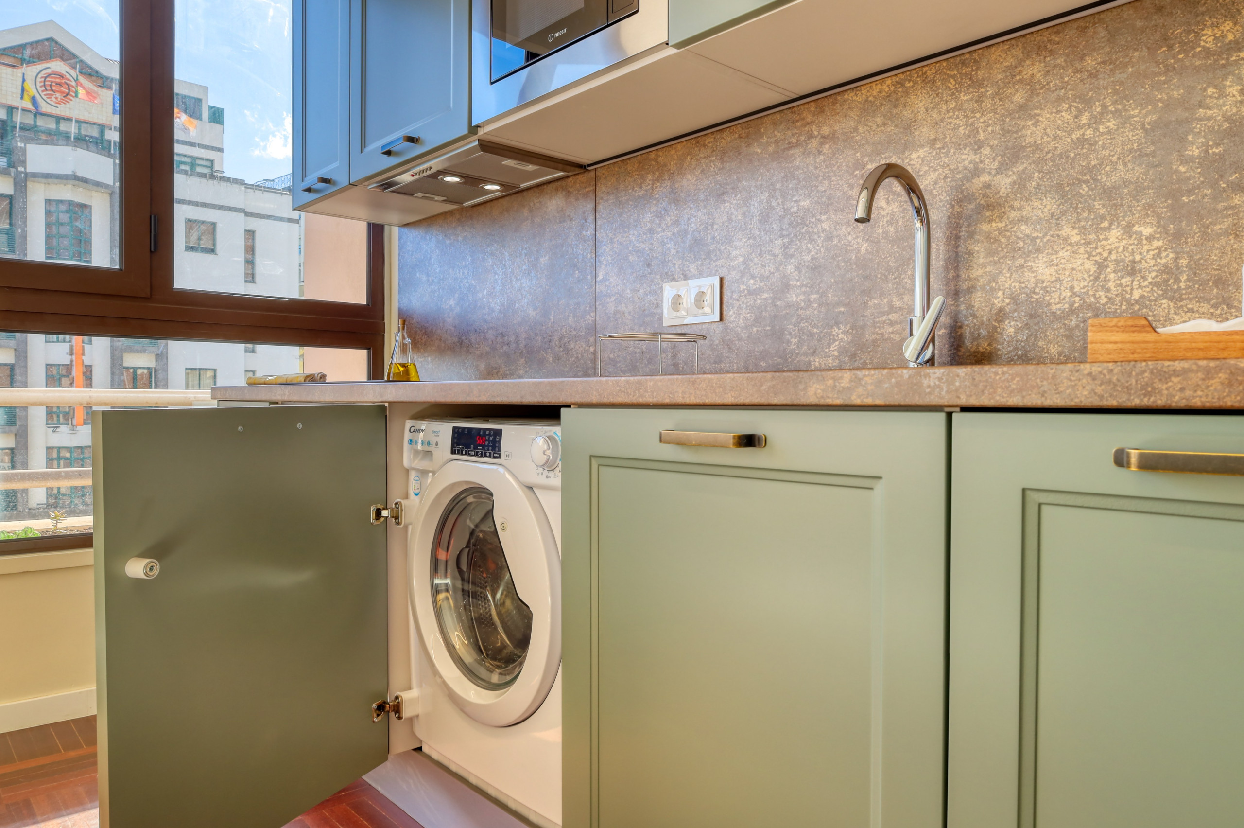 The apartment is equipped with air conditioning, refrigerator, washing-dryer machine, stove, oven, microwave, coffee machine and other utensils, as well as bed linen, towels, Wi-Fi, TV with international channels and other amenities to provide a pleasant and relaxed stay.